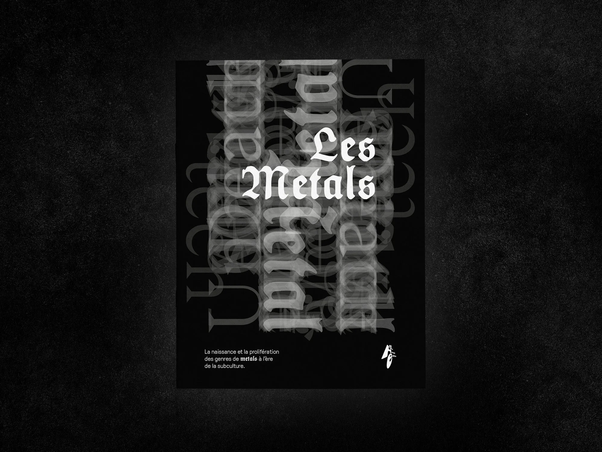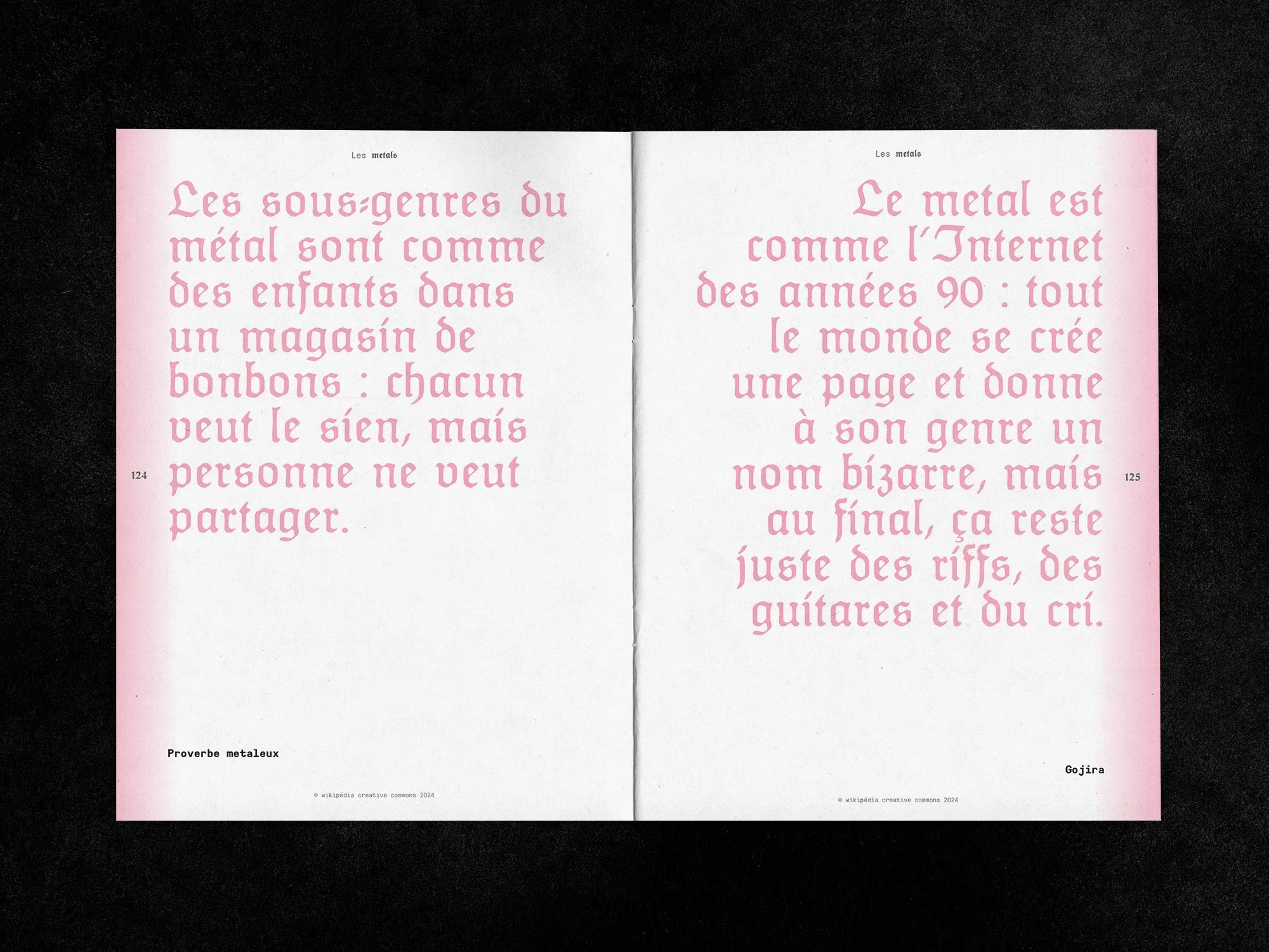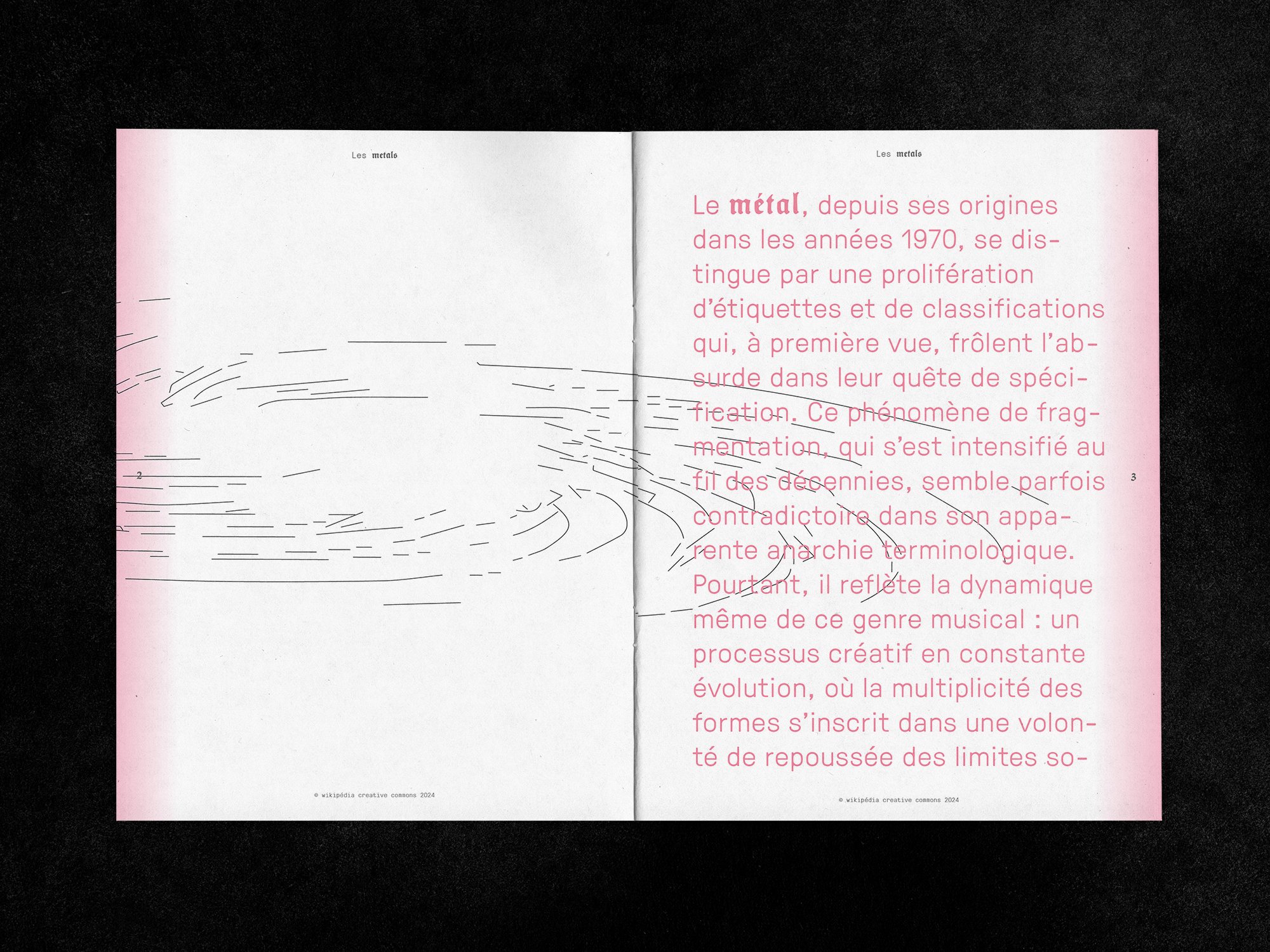 Les Métals est la première publication issue de ce processus. Ce projet prend la forme d’un livre expérimental consacré à la profusion des sous-genres de la musique métal, abordée par le prisme de l’absurde et de la distance critique.