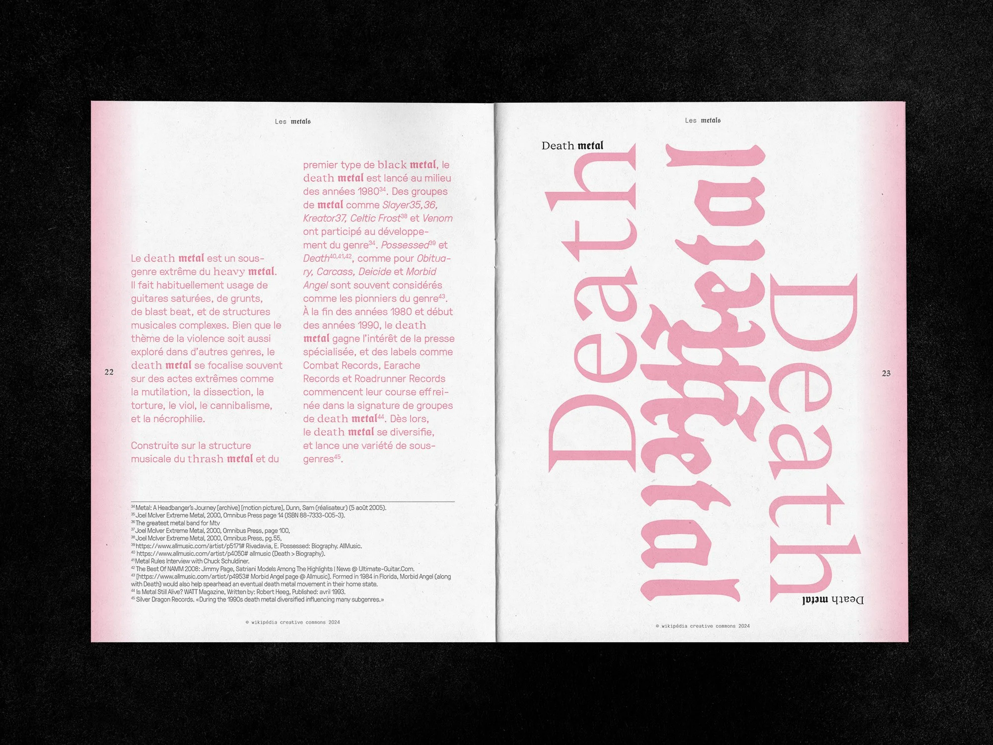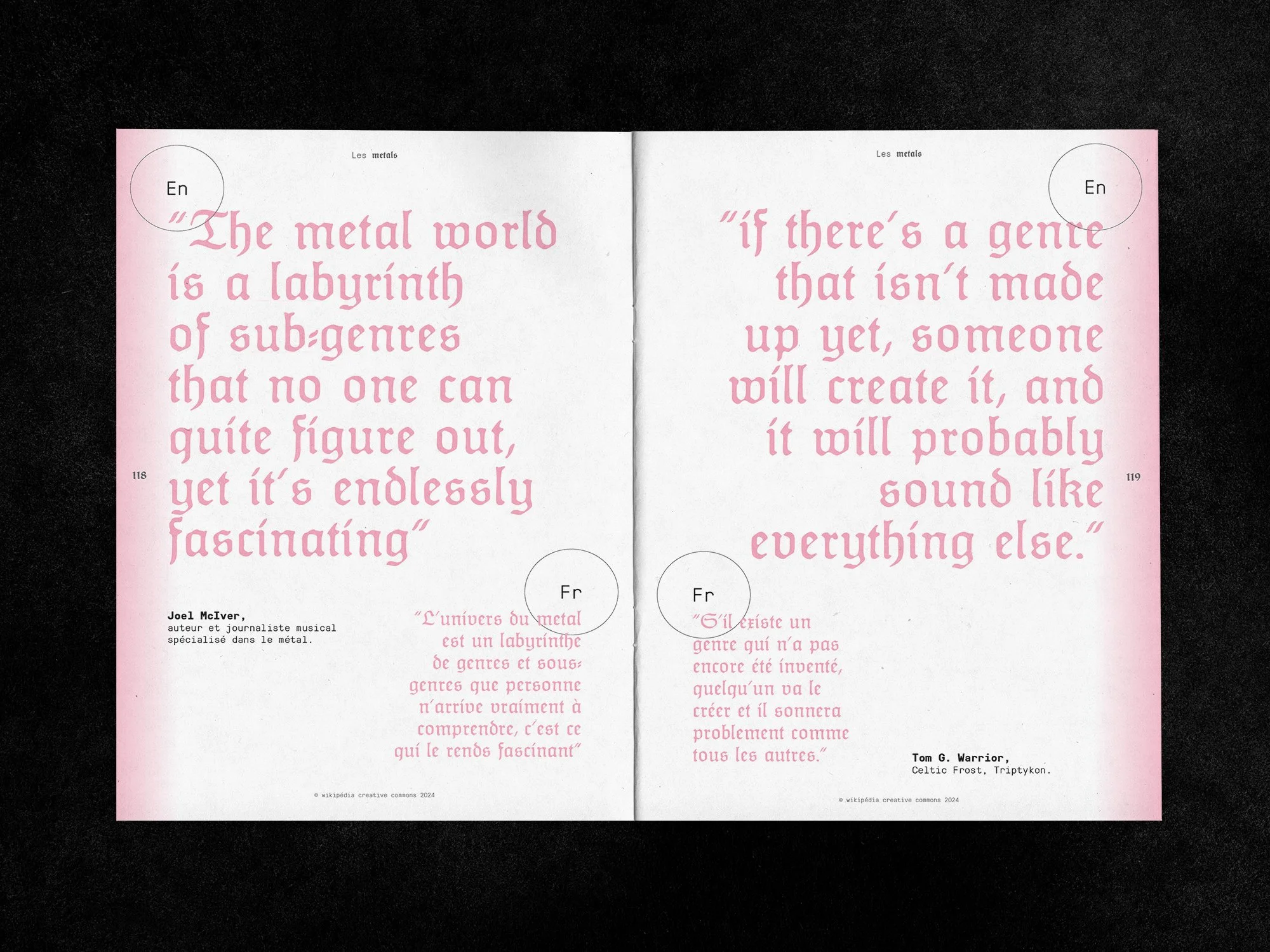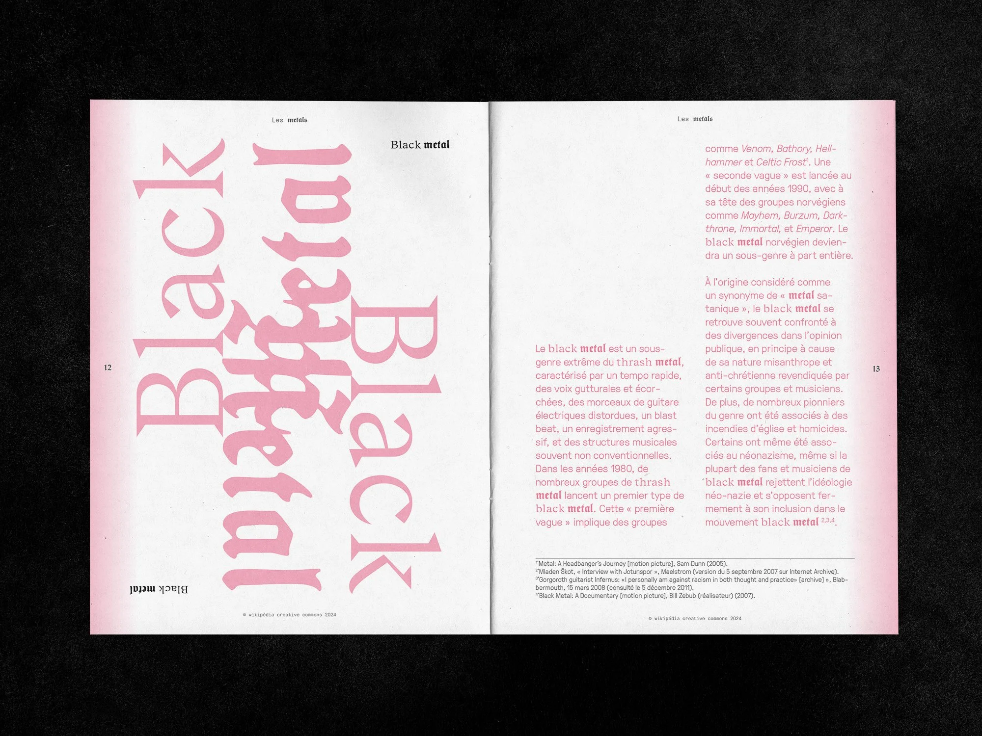 Les Métals est la première publication issue de ce processus. Ce projet prend la forme d’un livre expérimental consacré à la profusion des sous-genres de la musique métal, abordée par le prisme de l’absurde et de la distance critique.
